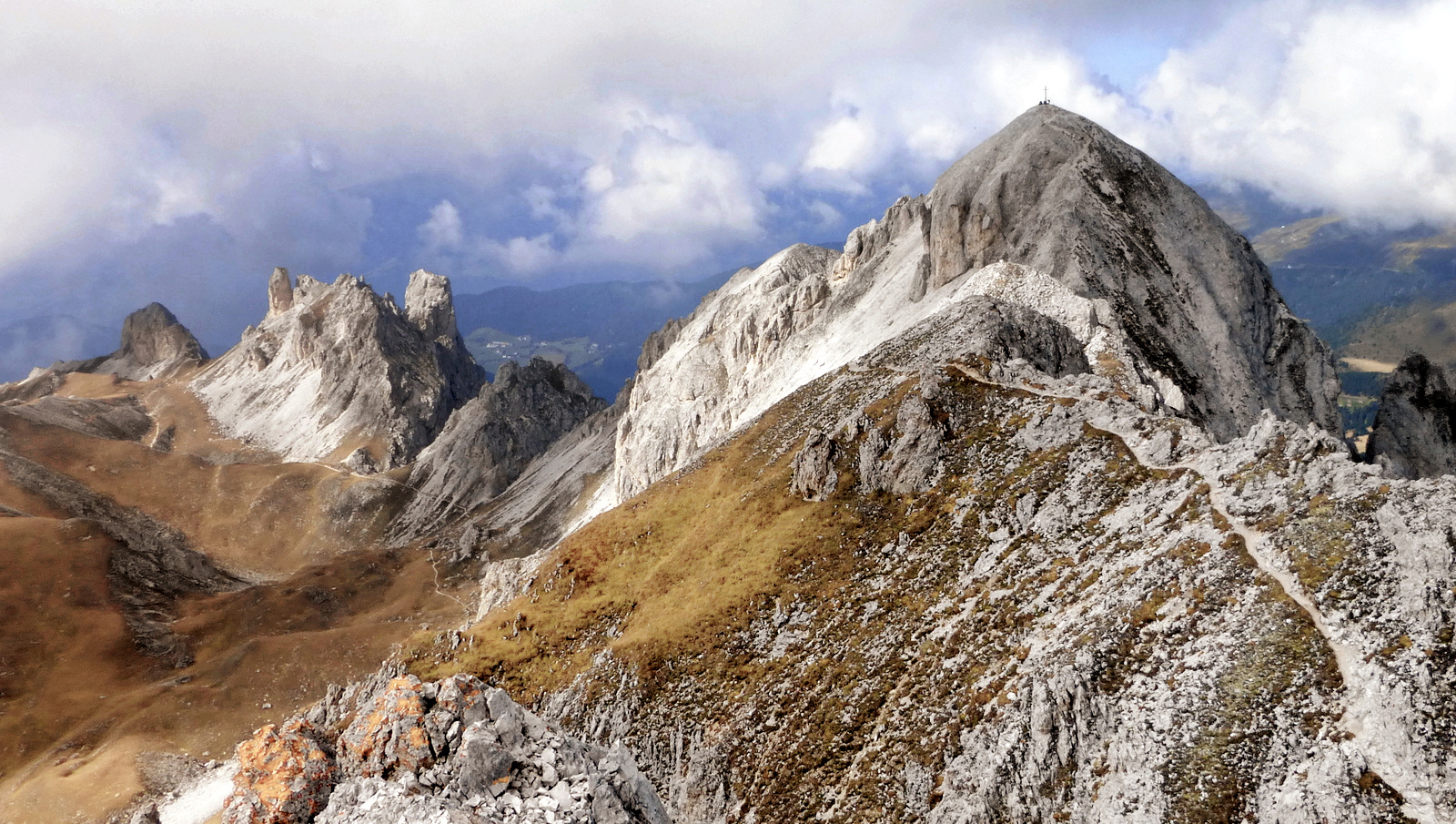 Dalla cima grandioso panorama a 360° che abbraccia molti gruppi dolomitici e alpini tra cui il Sass de Putia, le Odle, le Alpi Aurine le vedrette di Ries e in lontananza il Pelmo. Si ritorna in 15' al sentiero GM per la stessa traccia e si continua la traversata che ora diventa più aerea